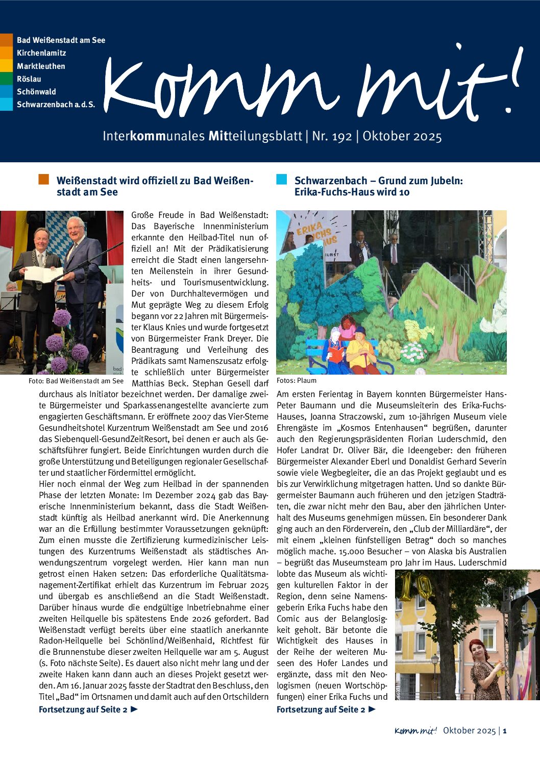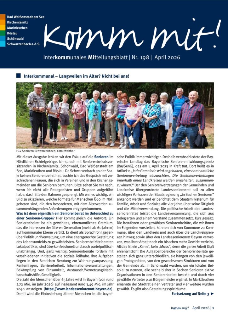 Mit durchschnittlich 10 Ausgaben pro Jahr und einer Auflage von jeweils 10.000 Stück informiert das Komm mit! die Bewohner des Nördlichen Fichtelgebirges seit 2006 zuverlässig über die Arbeit des Interkommunalen Verbunds sowie das Leben in den Kommunen. Damit ist es ein wichtiges Medium zur Stärkung der Identifikation mit der Region. Es zeigt, dass das Nördliche Fichtelgebirge ein lebendiger Landstrich ist, mit Menschen, die sich engagieren, und motiviert so die Leser, sich auch selbst für ihre Heimat einzusetzen.